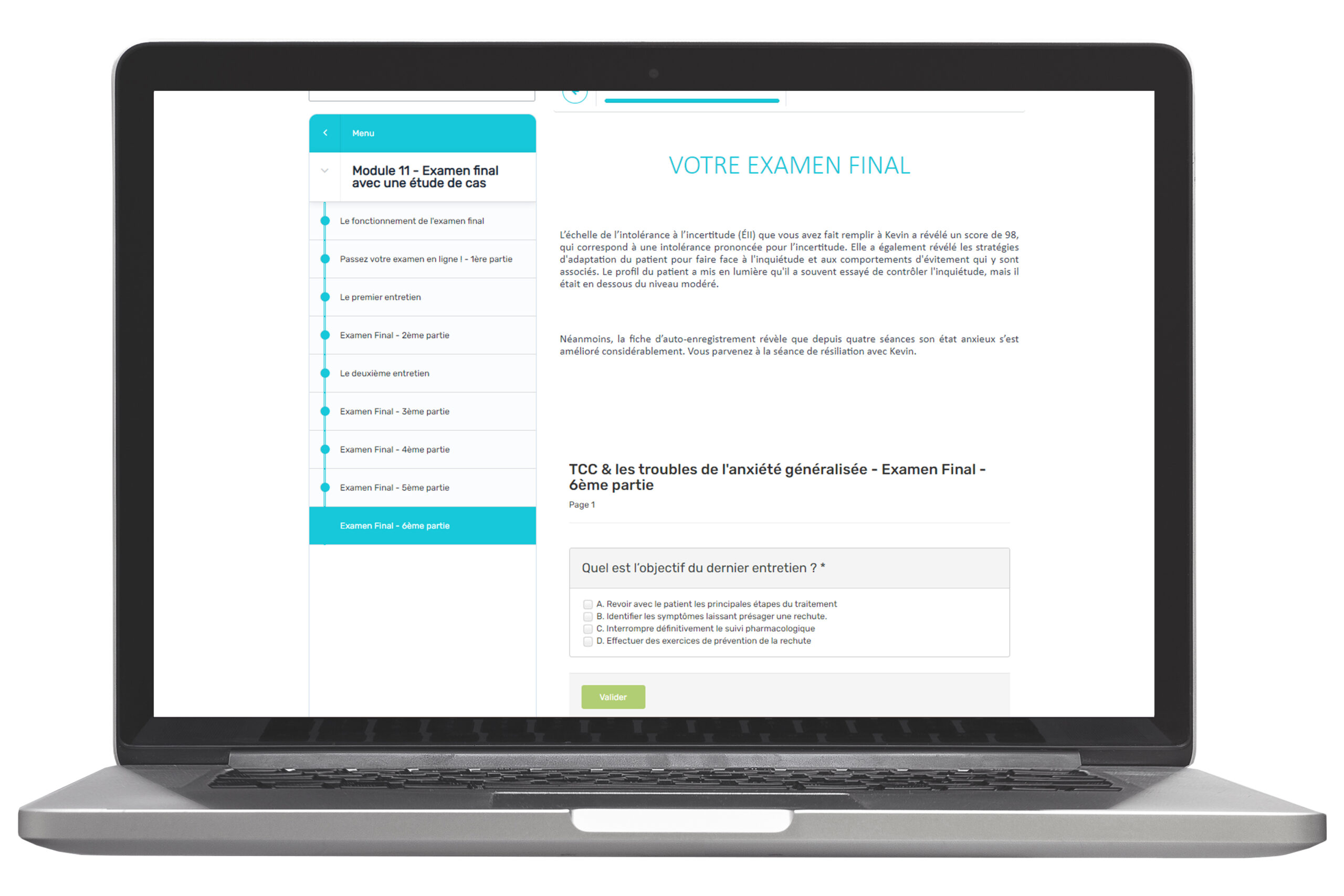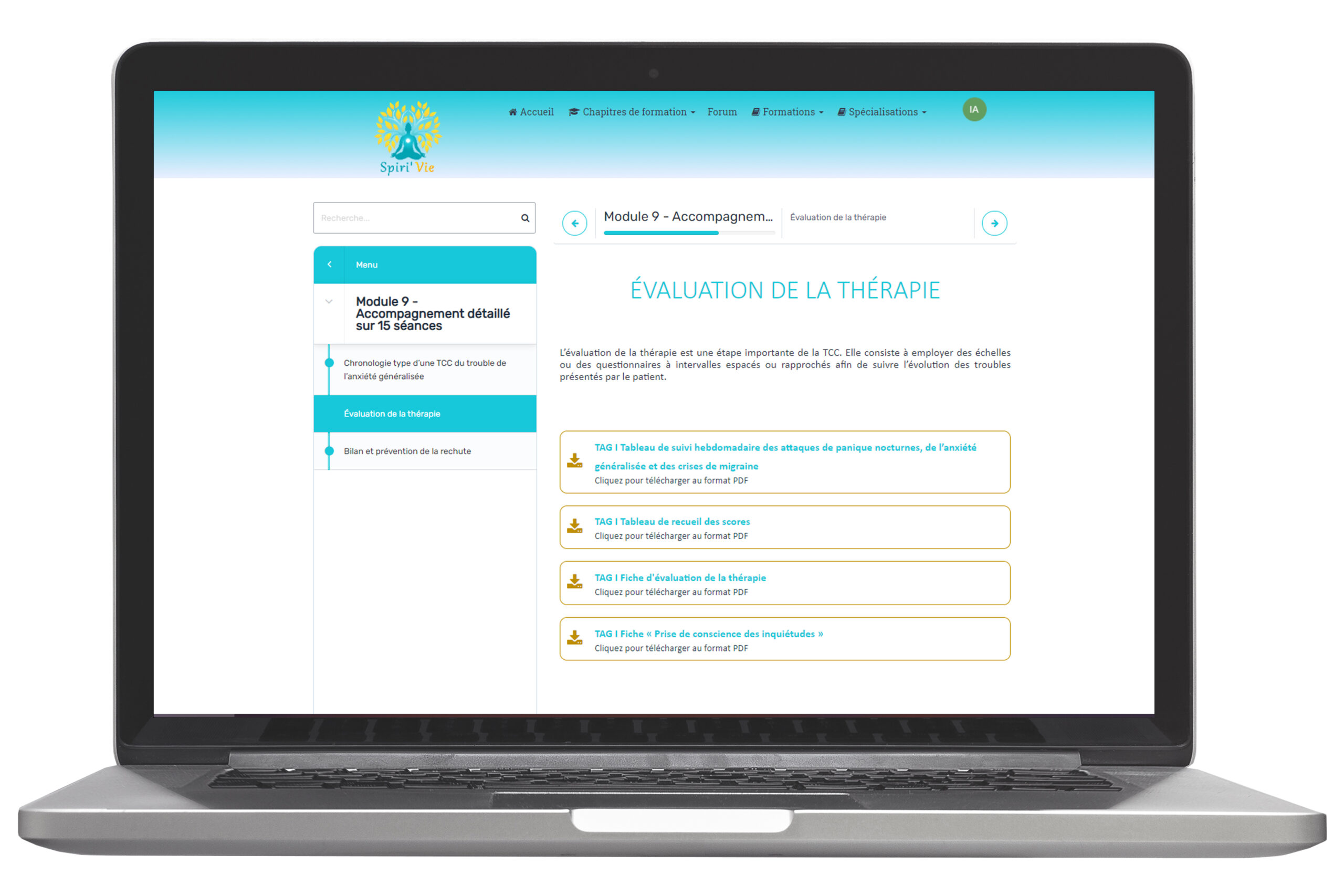 ✨ Le tout au fil de 9 modules structurés, accompagnés d’outils thérapeutiques puissants, d’exercices guidés et d’un examen final interactif basé sur un cas clinique réel — pour une maîtrise progressive, clinique et humaine de la TCC appliquée au TAG.